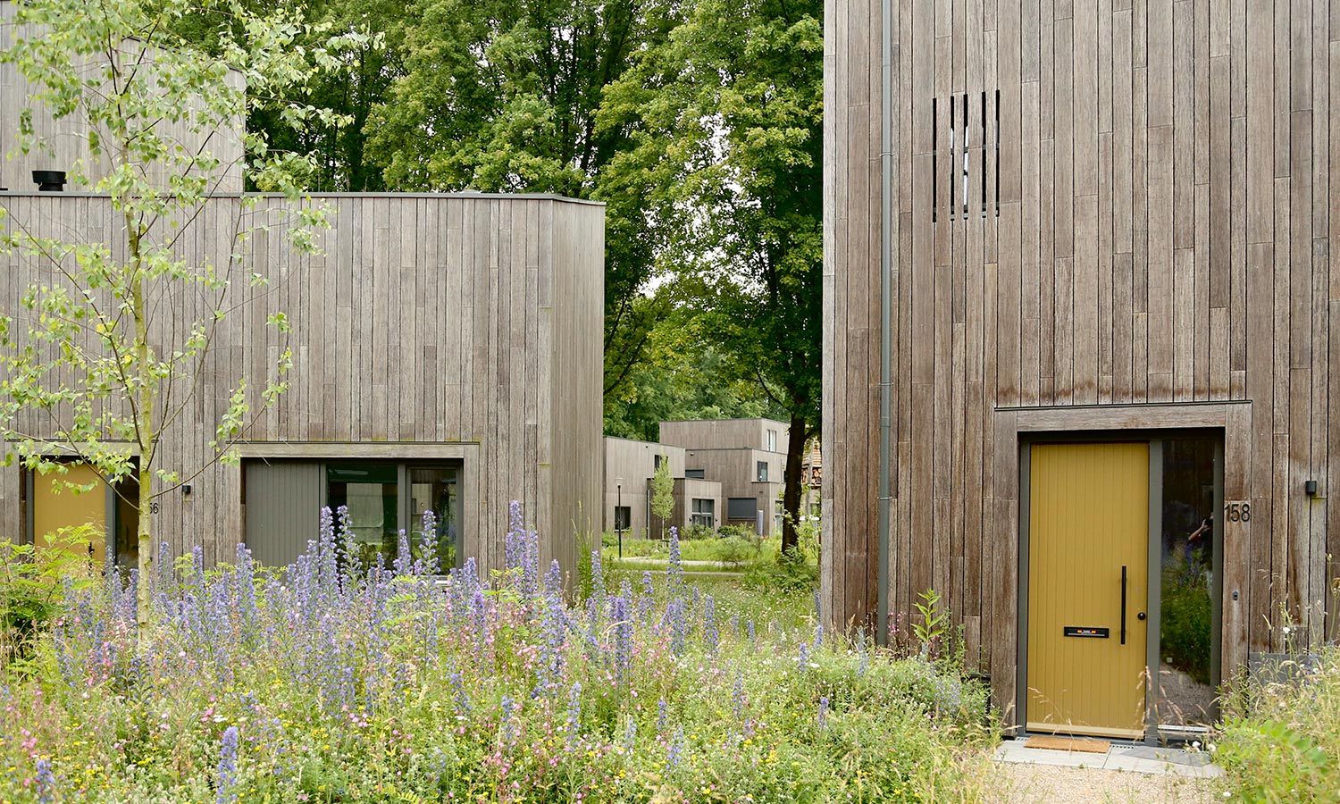 In een van de buurtjes in de Eindhovense wijk Meerhoven zijn landschap en bebouwing nauw verweven. In het hart ligt een natte zone – onder meer bedoeld voor de opvang van overtollig regenwater. Rondom staan de woningen aan hoger gelegen heidetuinen. Dit soort overgangen tussen hoog en laag, en tussen nat en droog doet de soortenrijkdom goed.